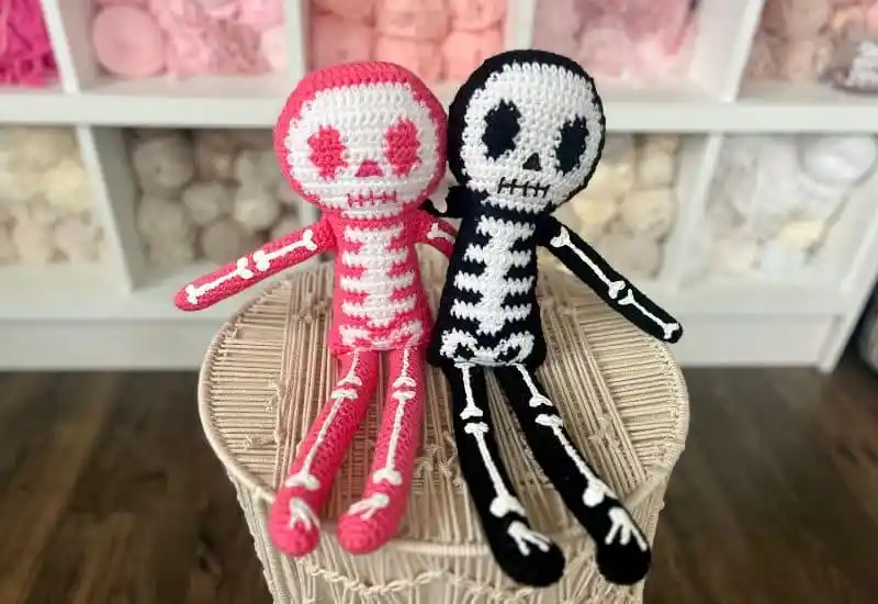 Friendly crochet skeleton doll, perfect as a toy or decoration.