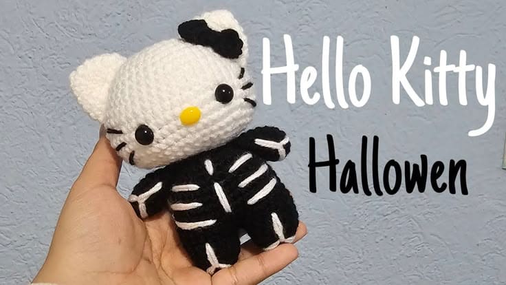Skeleton-themed Hello Kitty amigurumi for spooky fun.