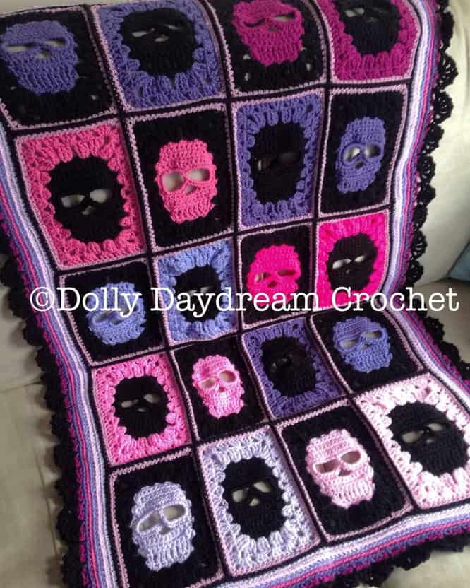 Bold granny square blanket with skull motifs — statement piece for advanced crocheters.
