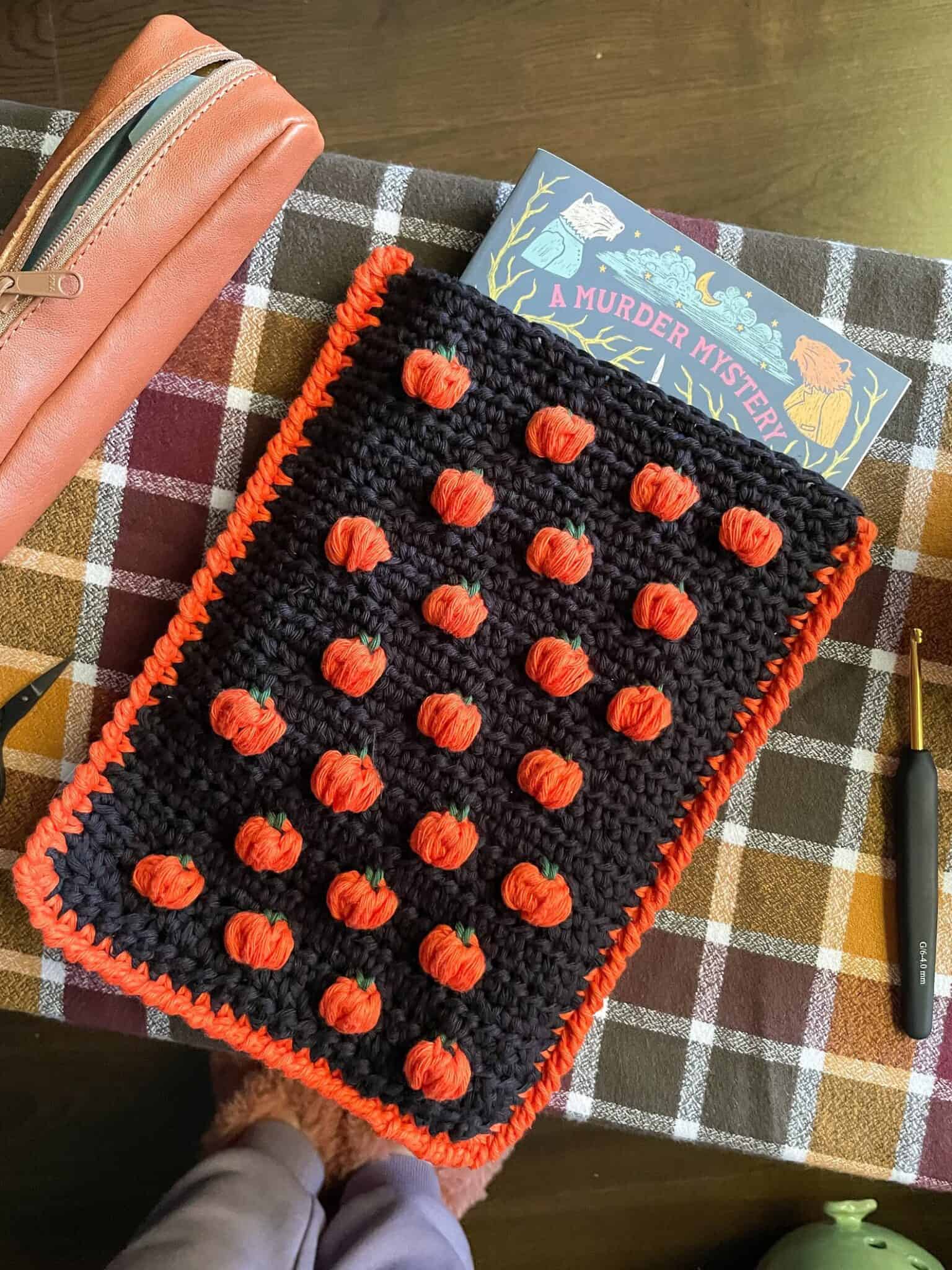 Pumpkin-themed crochet book sleeve to protect your favorite reads.