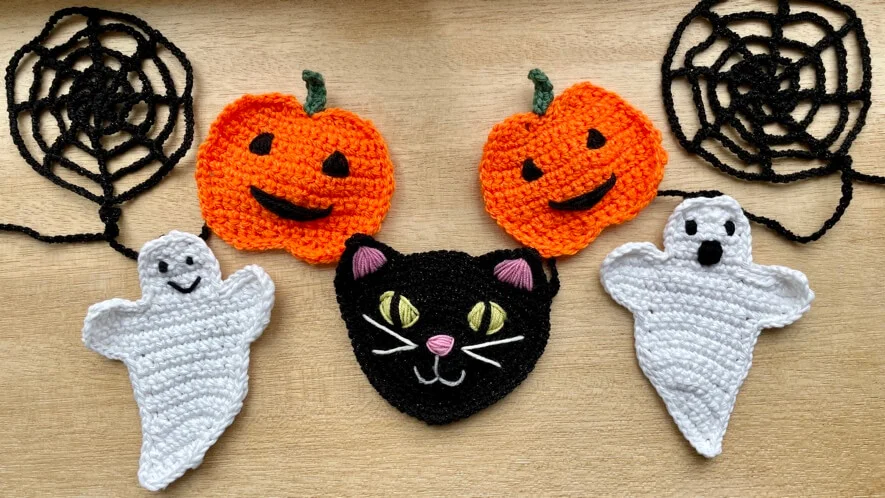 String together crochet Halloween themed motifs for an easy garland to hang on your mantel or wall.